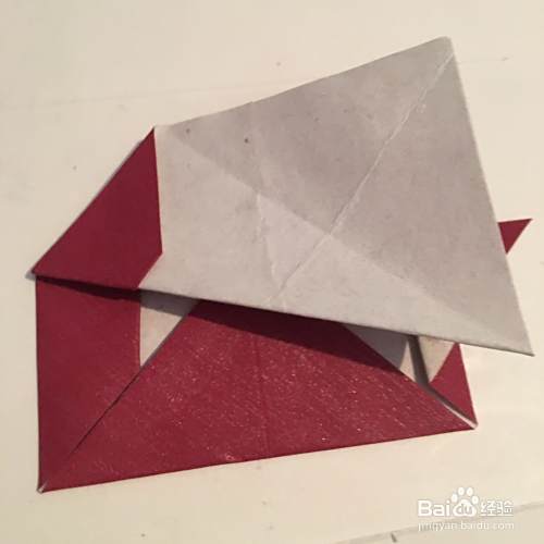 第四步 折叠完之后 从上向下对折 然后再取开上页里面的三角放下来
