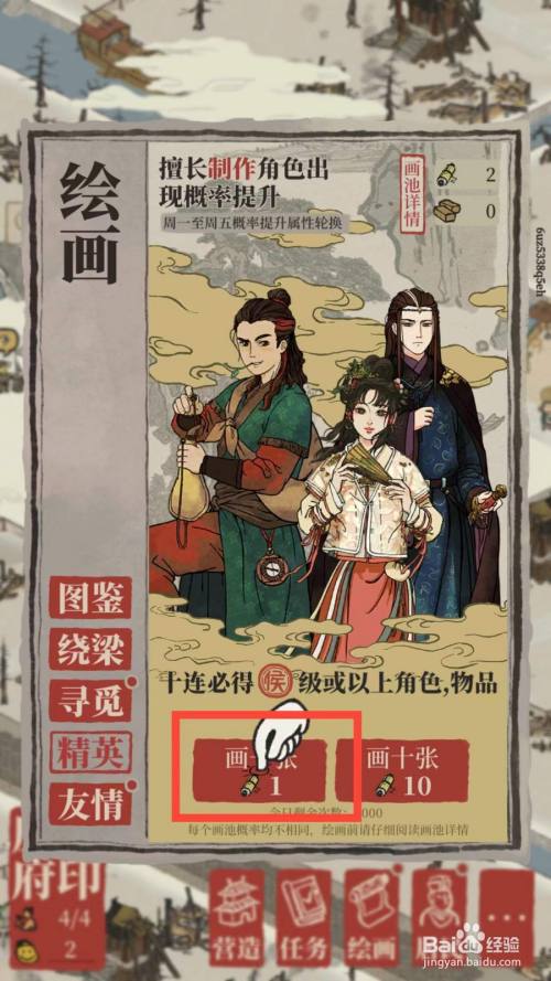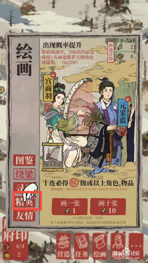 江南百景图获得吴黎居民在游戏主页面选择绘画选项,选择精英选项,点击画一张选项,即可获得新居民吴黎,具体操作方法如下: