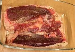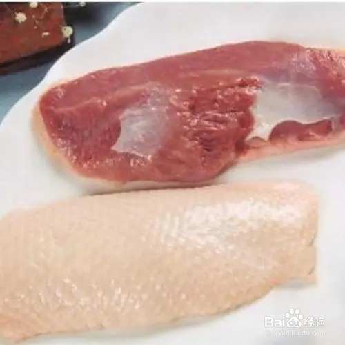 鸭脯肉洗净后,放入碗中,倒入料酒、生抽、姜汁、白糖,揉搓均匀腌制4个小时。