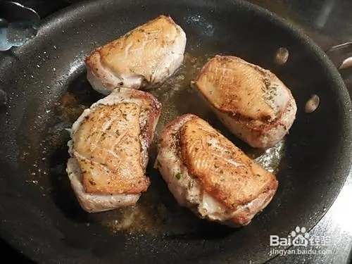 锅内放入少许油,烧热后放入腌制好的鸭胸脯肉,小火慢煎,先煎带皮一面,再翻面煎。