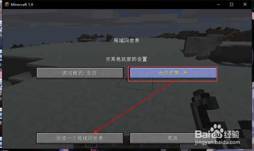 接着我们把作弊指令打开,如果没有这个我们是不能用指令的,只有打开了这个我们才能用指令!如同,然后点击一个创造局域网世界