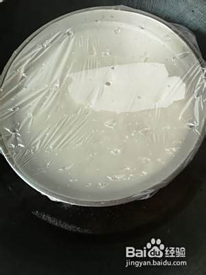 盖上保鲜膜,扎洞洞。锅里水开后蒸25分钟即可,拿出来揭下保鲜膜,如马蹄糕上面有点水,就倒掉,放凉就可以切了