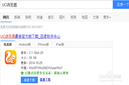 首先在百度中搜索UC浏览器,选择普通下载。