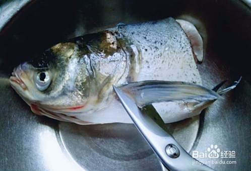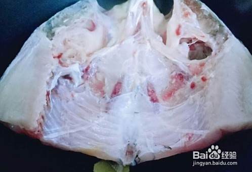 去除鱼头内黑色一层皮。(据说这黑色一层皮是最脏的)