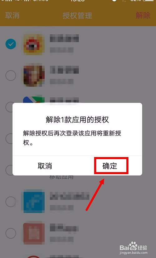 选择需要解除授权的应用,点击右上角的解除,这个时候系统会进行提示,咱们不用管它,点击确定解除即可!