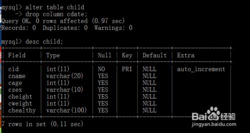 第五步,我们修改完成之后,输入 desc 表名; 我们查看表结构,发现表已经做出改变了。