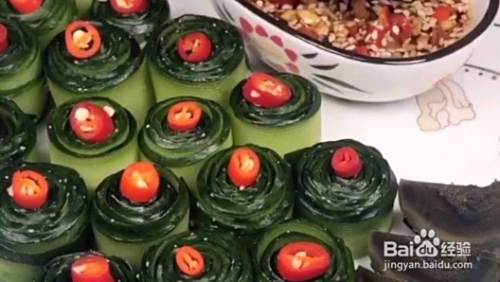 接下来,我们将卷好的黄瓜卷摆出孔雀开屏的效果,如图;