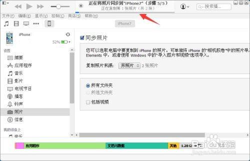 之后点击iTunes右下角【同步】按钮,在iTunes上方就会弹出“正在将照片同步到iPhone”的窗口,最后等待传输结束,再进入手机里面即可看到导入的照片。