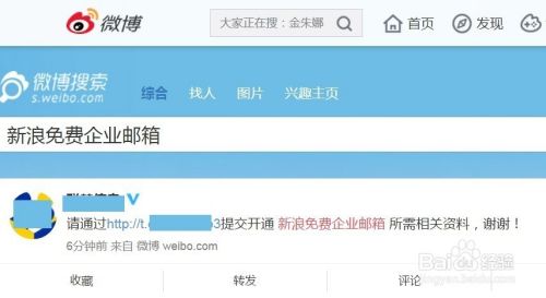 提交资料:也可通过新浪微博搜索 新浪免费企业邮箱 如图所示,点击微博中链接提交开通所需相关资料