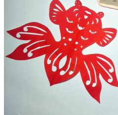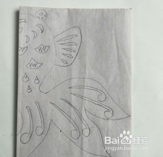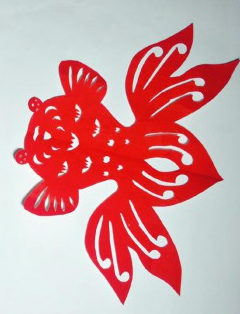 接着画出金鱼的眼睛和鳍,用剪纸的月牙纹,水滴纹等等来装饰金鱼的身体