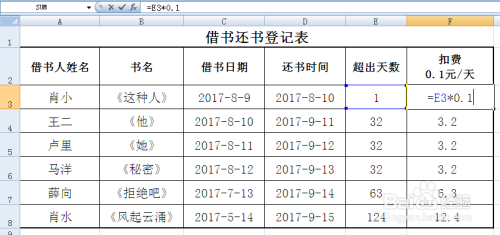 选中E3单元格,输入公式:=datedif(c3,d3,"d"),回车,用于计算第一个人超出借书日期的天数,将鼠标移至E3单元格右下角成“黑色十字”状时,按住左键向下拖拽至E8单元格,回车,计算其余人超出借书日期的天数。