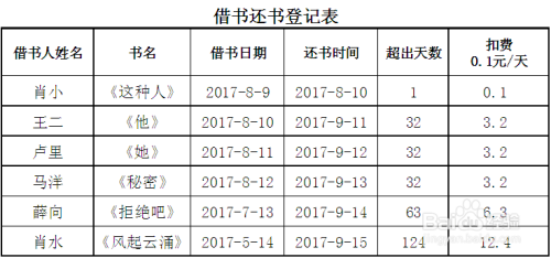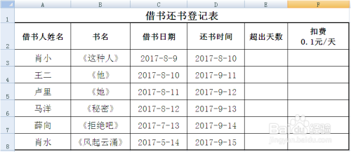 这有一张职工借书登记表,如何利用Excel计算超出“还书日期”天数以及罚款金额,这里超出一天按照一角计算。