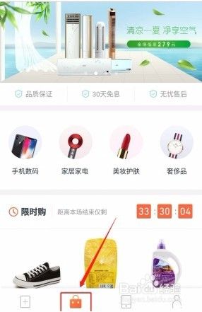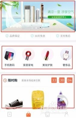 顶部滚动的banner图上会有当季潮流新品。下面有“手机数码”、“家居家电”、“美妆护肤”、“奢侈品”四大品类。再下面有限时购活动。