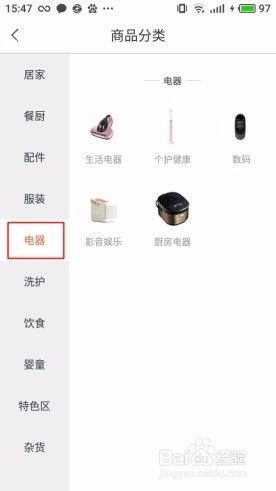 各个分类中有更具体的产品。例如点击电器,里面还有生活电器、个护健康、数码、影音娱乐、厨房电器等细分商品。