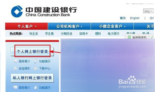 然后进入中国建设银行官网后,在最上方找到“个人网上银行登录”一项,点击进入。