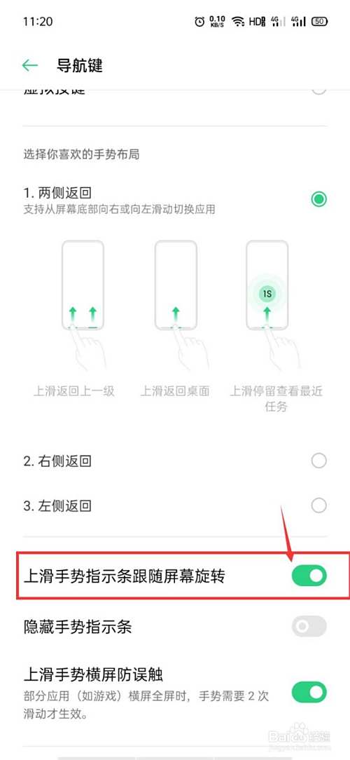 我们已经开启上滑手势,可以滑动屏幕,找到最下方的【上滑手势指示条跟随屏幕旋转】,把开关打开,即可解决我们屏幕不能滑动的问题。