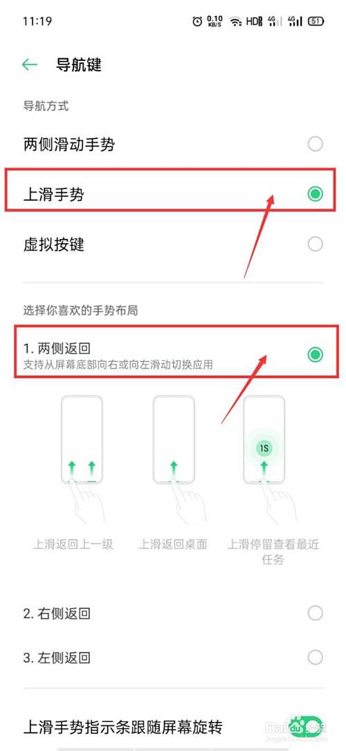 手机处在虚拟按键模式下,我们取消虚拟按键,选择【上滑手势】,然后下方点击【两侧返回】。