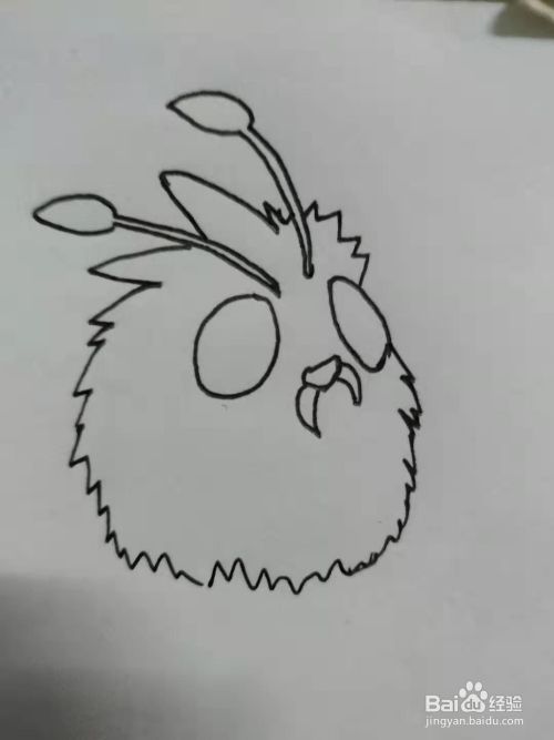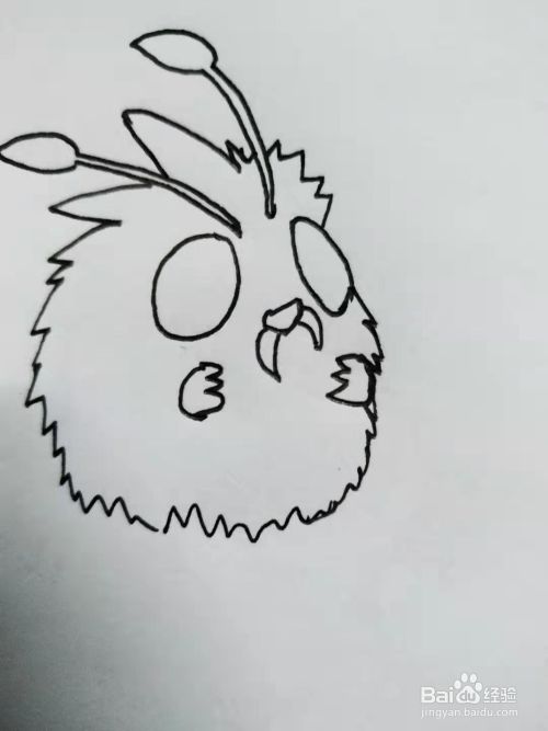 再向下画上小椭圆作为鼻子,左右两侧各有一颗獠牙,头顶上画上细长的触角;