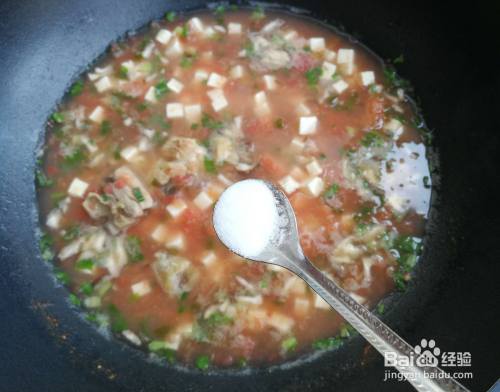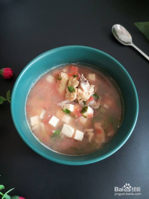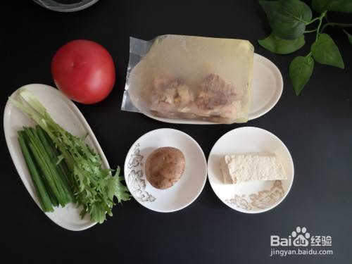 原料:西红柿、豆腐、香菇、原味鸡汤、葱、苦菊