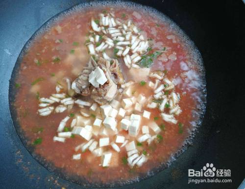 葱和苦菊切碎,香菇和豆腐切小块,西红柿去皮切块