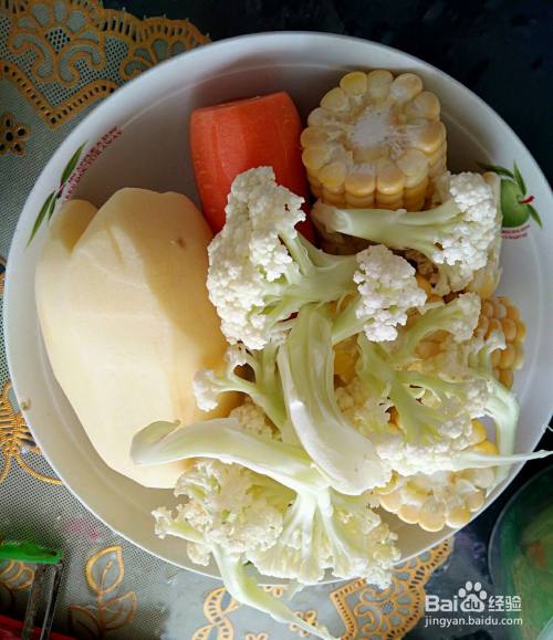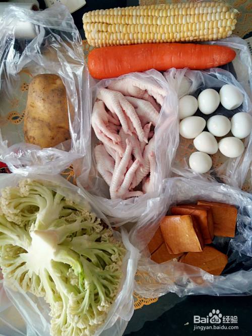 花菜掰开;玉米切段;土豆切块; 胡萝卜分成对半,一半切块。 另一半的胡萝卜和西红柿用料理机榨汁。 鸡爪+姜+蒜=焯水