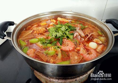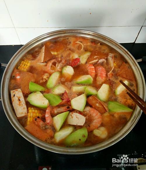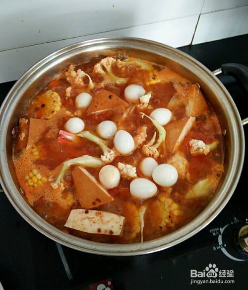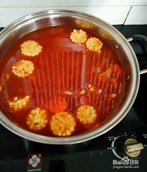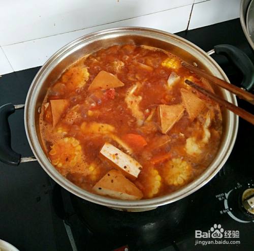 在锅底摆上玉米段和豆腐块,再把刚刚煮沸的汤料倒进去,煮开。