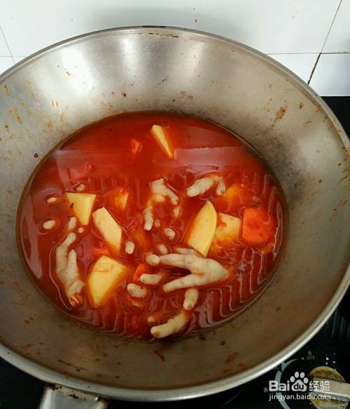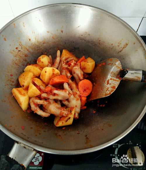 先放鸡爪炒,然后再加胡萝卜块和土豆块。