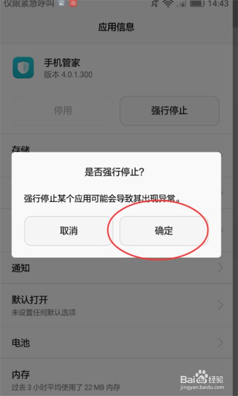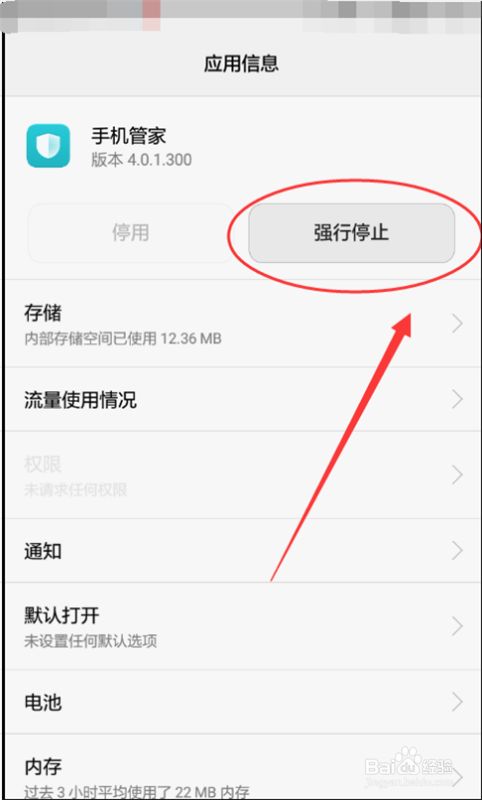 4、在手机管家的应用管理页面上方,可以看到强行停止的选项,直接点击,对应用进行强行停止。