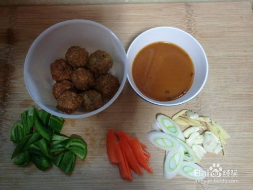 青椒切块,胡萝卜切片,葱、姜和大蒜切成图中的样子,另取一碗做芡汁,碗中放入一小勺淀粉、10毫升生抽和少量盐,加入适量水搅匀;