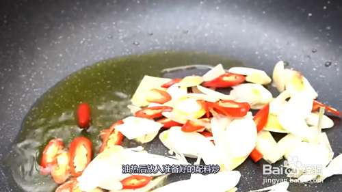锅中加入适量的油,油热后放入准备好的配料炒,炒出香味后放入腌制好的猪肝。