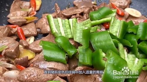 大火翻炒猪肝,直到猪肝变色后往锅中加入适量的青椒,翻炒半分钟左右。