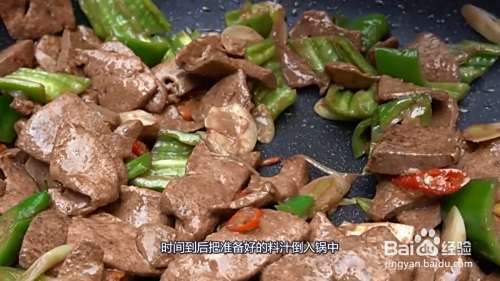 先把碗中加入准备好的调料调一个料汁备用,然后把猪肝放入锅中炒,炒香后放入青椒,翻炒均匀后加入料汁翻炒均匀即可出锅。