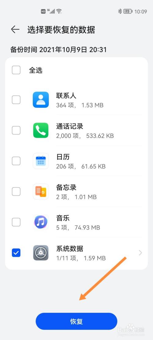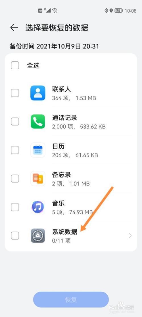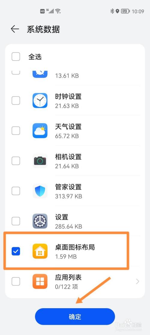 去掉全选后进入系统数据,勾选桌面图标布局并点击确定。
