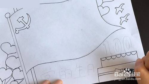 在右下角的位置画一个大的生日蛋糕,写上100的字样。