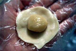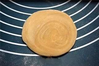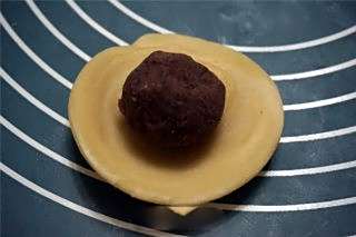 取一个水油皮弄成圆形,将油酥团放在中间,然后包起来,收口向下。