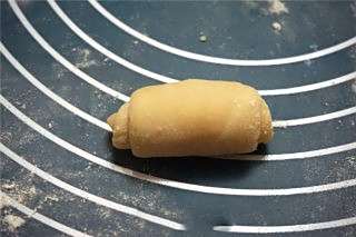 案板上洒少许面粉,用面杖将面团擀成椭圆形,由上往下卷起来。