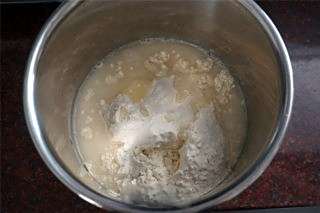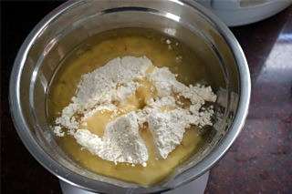 然后做油酥皮:中筋面粉200g和花生油100g混合在一起揉匀。
