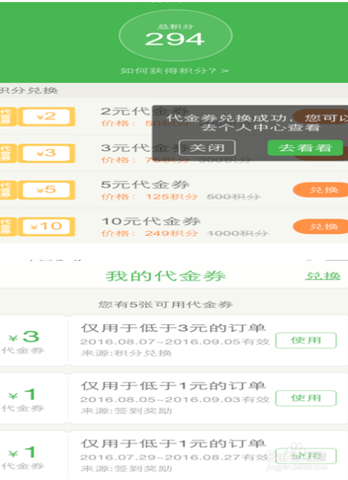 然后用赚来的积分可以去兑换代金卷,在个人中心可以查到我的代金卷。