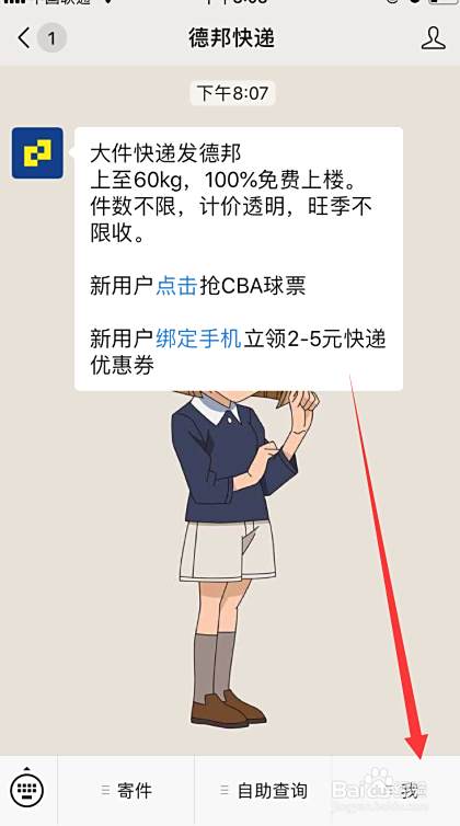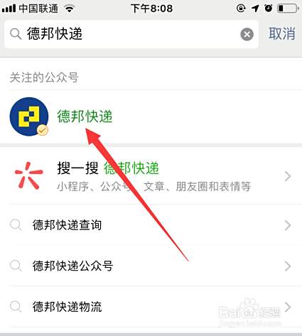 进入搜索框后,如下图所示直接搜索德邦快递,进入其官方公众号。