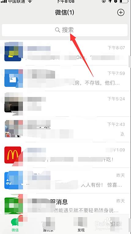 首先进入微信app,如下图所示点击页面上方的搜索框。