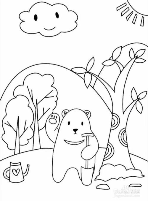 再画出身后的远山、两棵树和天上的白云,白云要画出微笑的表情,还有小熊身侧的水壶,壶上要画出一个爱心形状