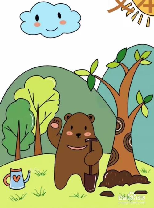 最后,给图片涂上好看的颜色,这样一幅简单又漂亮的植树节儿童画就完成了