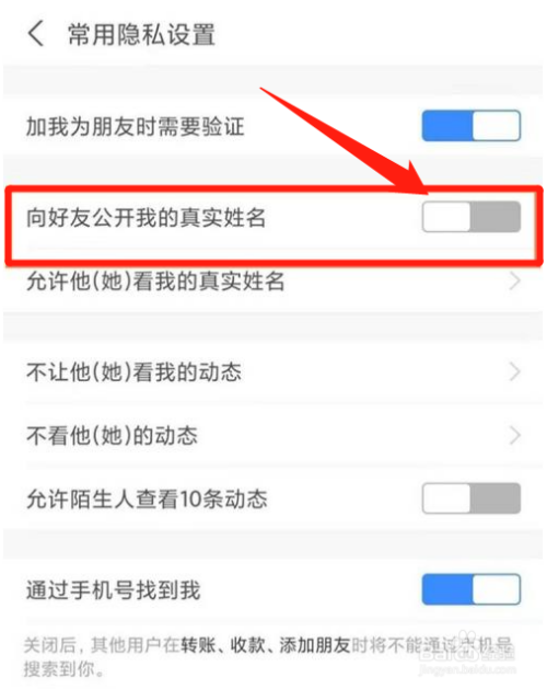 4、进入页面后,将向好友公开我的真实姓名的开关关闭即可。