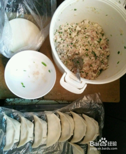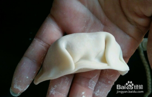 2.再两边靠中间折叠捏紧,完成1个饺子。按以上步骤逐个完成包饺子。晚上一家三口的晚餐就做好了。水开后下锅煮,中间煮开后再少量加3次冷水,观察饺子饱涨起来,皮变晶莹透明了就算煮熟了。碗里放少许酱油和猪油,将煮好的饺子盛碗,最好洒点葱花。其他调料凭君喜欢。开吃吧!