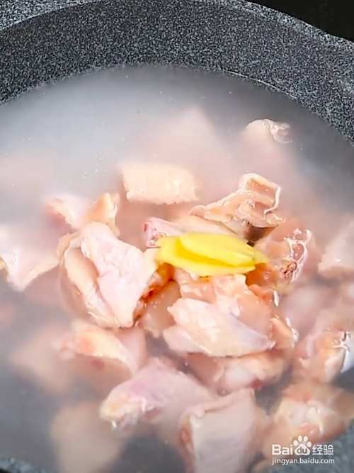 鸡肉冷水放入水中,放入姜片、料酒,水开捞出,鸡肉备用。