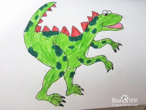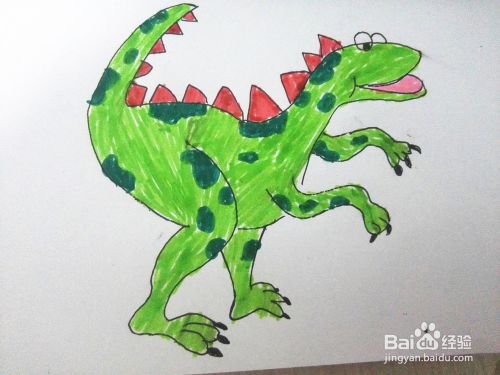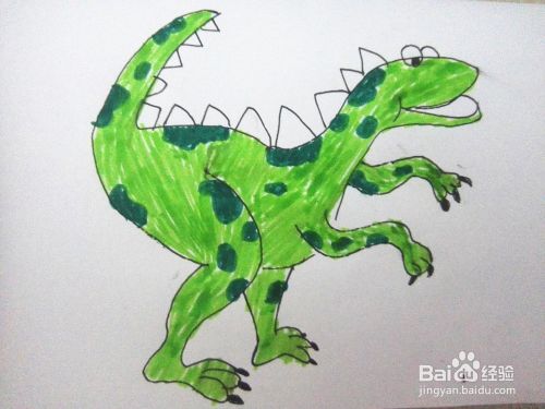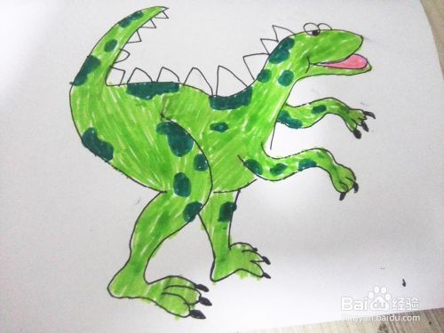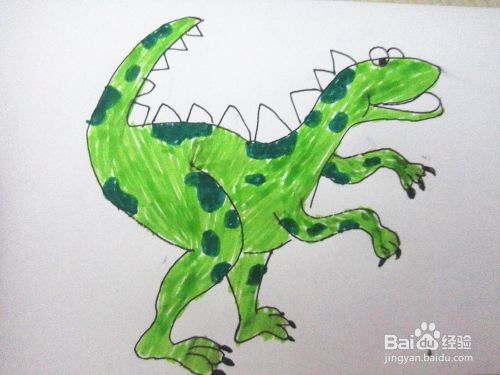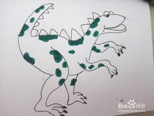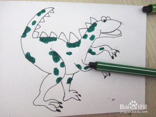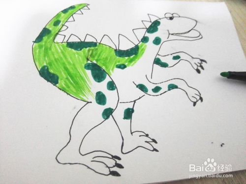 用墨绿色的彩笔在恐龙身上画上斑点。