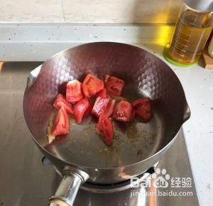 番茄洗净切块儿备用;面筋切块儿备用。起锅放少许油,放入姜丝,把番茄放入翻炒。