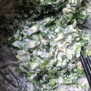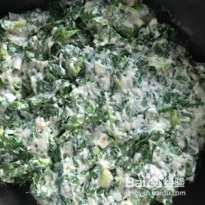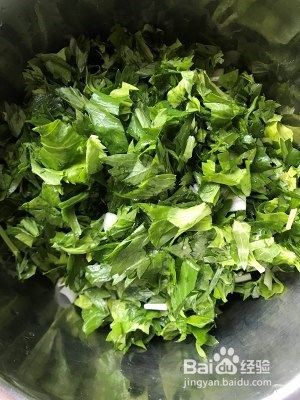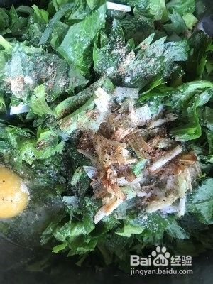 葱花和葱油一起倒入芹菜叶中,再加入鸡蛋两个,盐、白胡椒、五香粉拌匀~