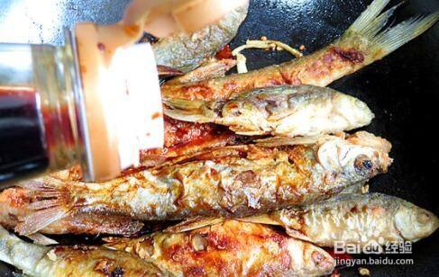 然后用另外一个锅倒油,倒入姜蒜、辣椒,炒出香味,再倒入煎好的小鱼,加点生抽和老抽,再加点盐和水,用小火慢熬