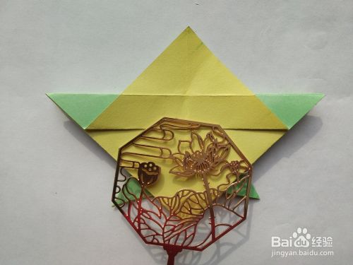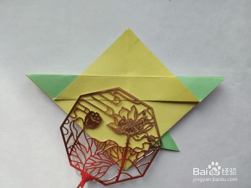 沿折痕将其中一角折到中心点处,之后翻面,将其余三个角向中心点折,之后将彩纸沿折痕聚合成三角形。